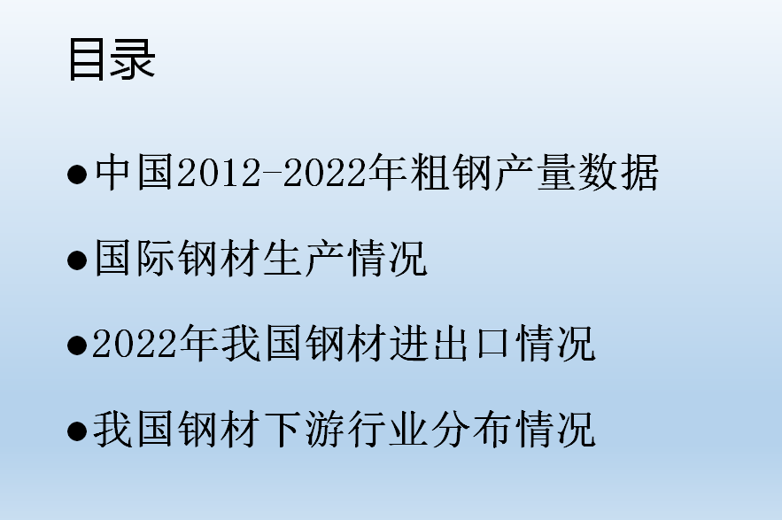 •我國現(xiàn)階段已經(jīng)初步實現(xiàn)城鎮(zhèn)化的建設,隨著房地產(chǎn)需求的下滑,我們普通鋼材很難有一個大的增量,但是我國的特殊鋼材還有很大的發(fā)展空間。結合國家鋼材發(fā)展現(xiàn)狀,我們也慢慢的理解公司制定“高端、國有、人無我有”政策的現(xiàn)實依據(jù),希望大家能出通過了解行業(yè)發(fā)展的方向,明確目標,開發(fā)客戶,更好的規(guī)劃自己的銷售,取得好的業(yè)績。